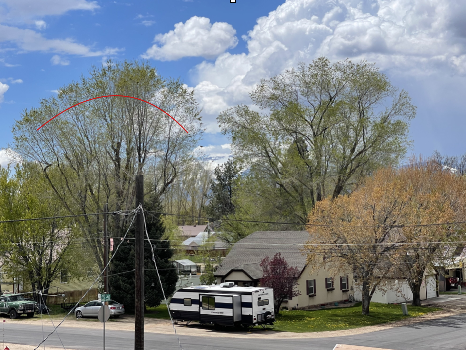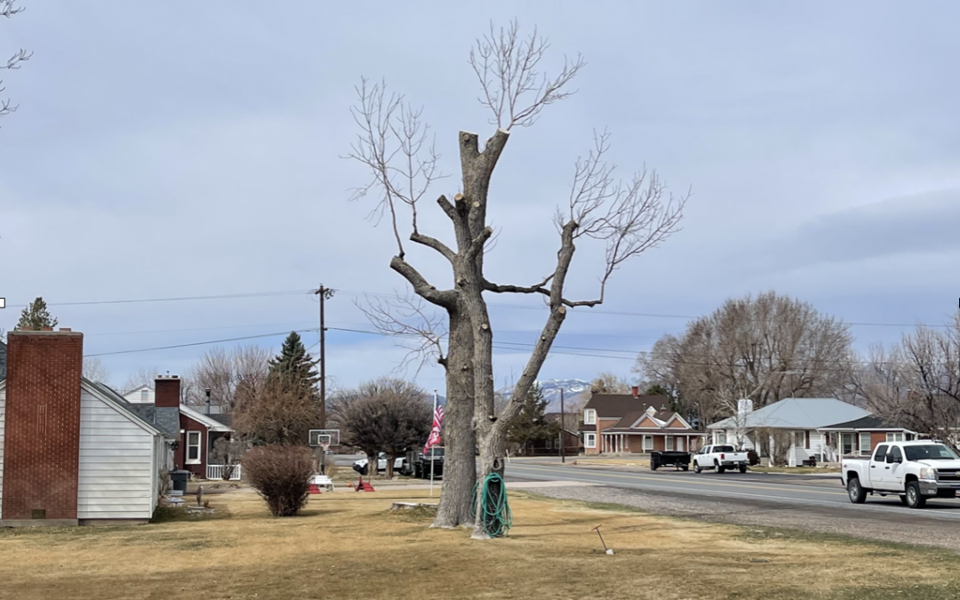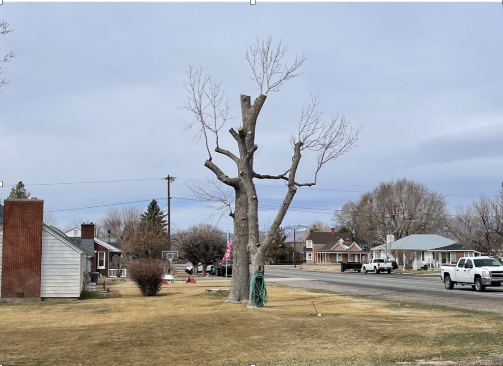 The two largest trees in the image are the same age and species. The left one was “topped” at the red line. Within two years the tree has regrown to its original height. The new growth are slender sprouts, poorly attached, and growing from large cuts that could decay. The one to right retained its original and stronger form.